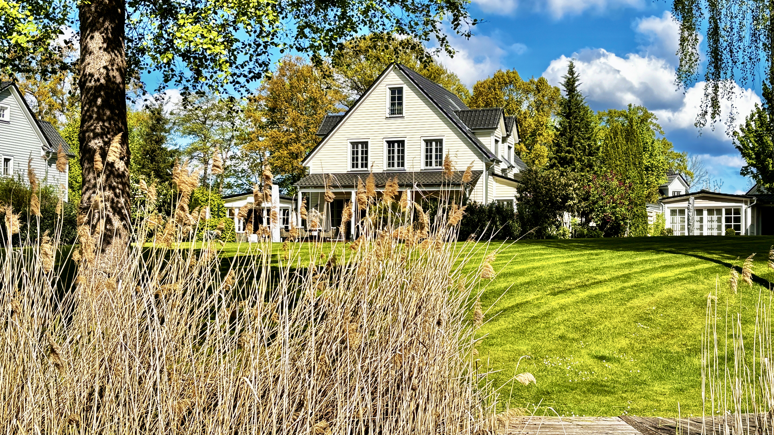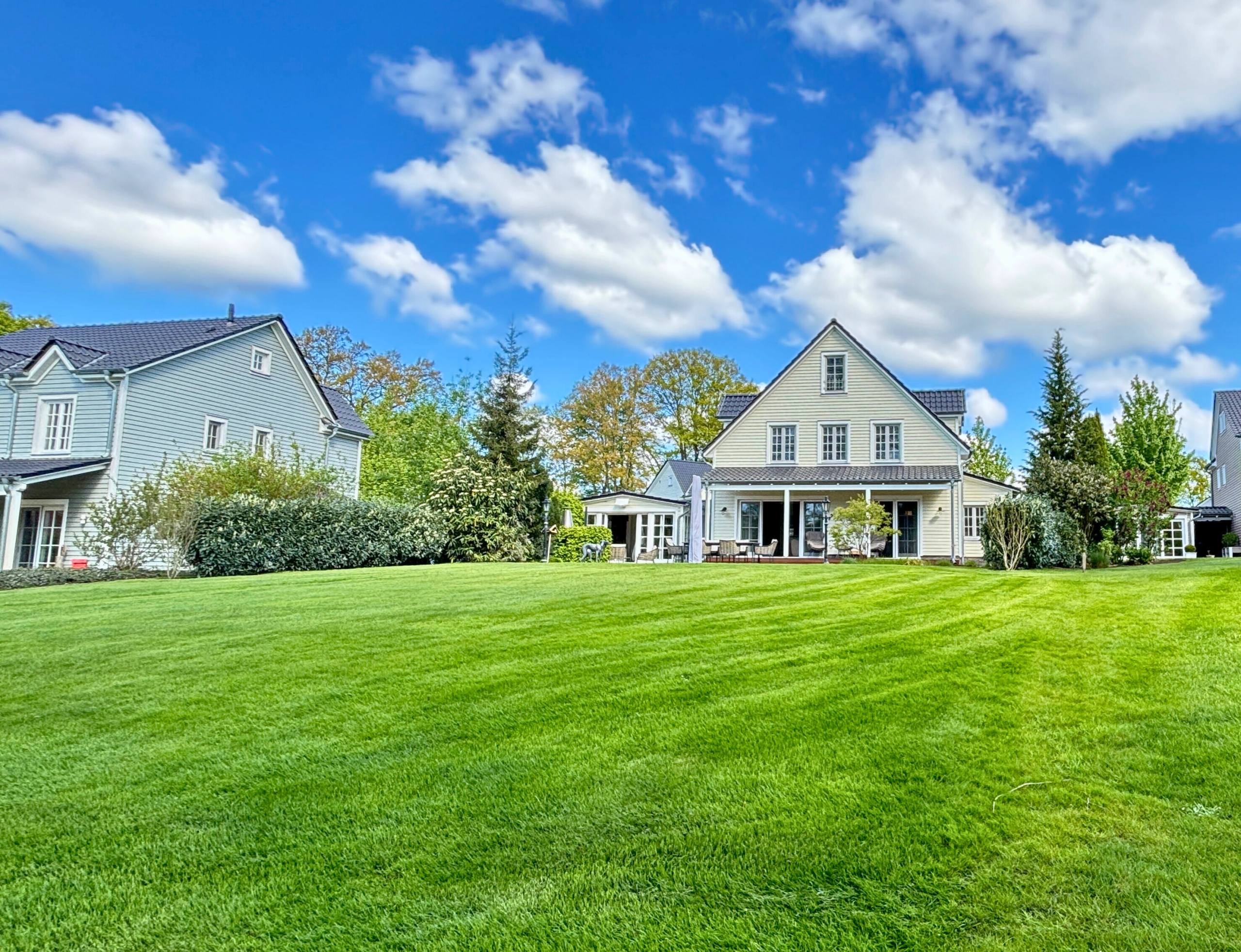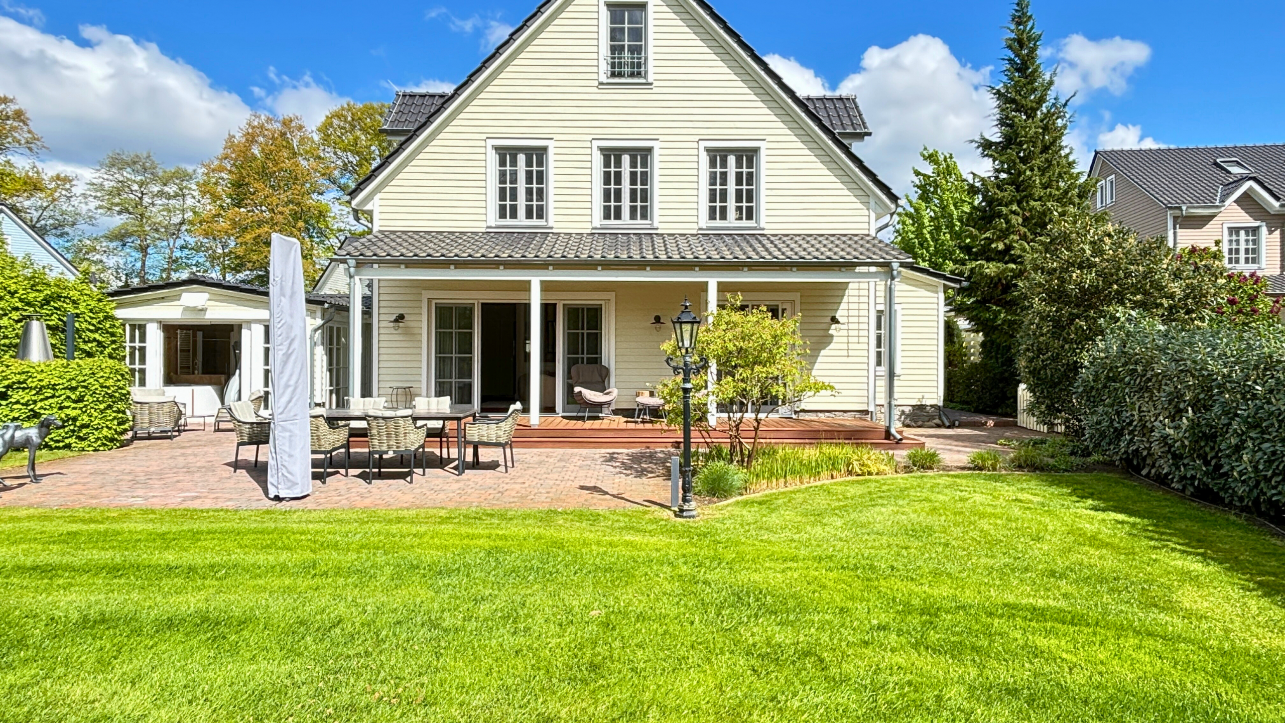 Klassisch stilvolles Landhaus aus Holz von amerikanischer Architektur inspiriert mit Spa Bereich und Doppelgarage auf einem 1211 qm großzügigen Anwesen am Wasser!
