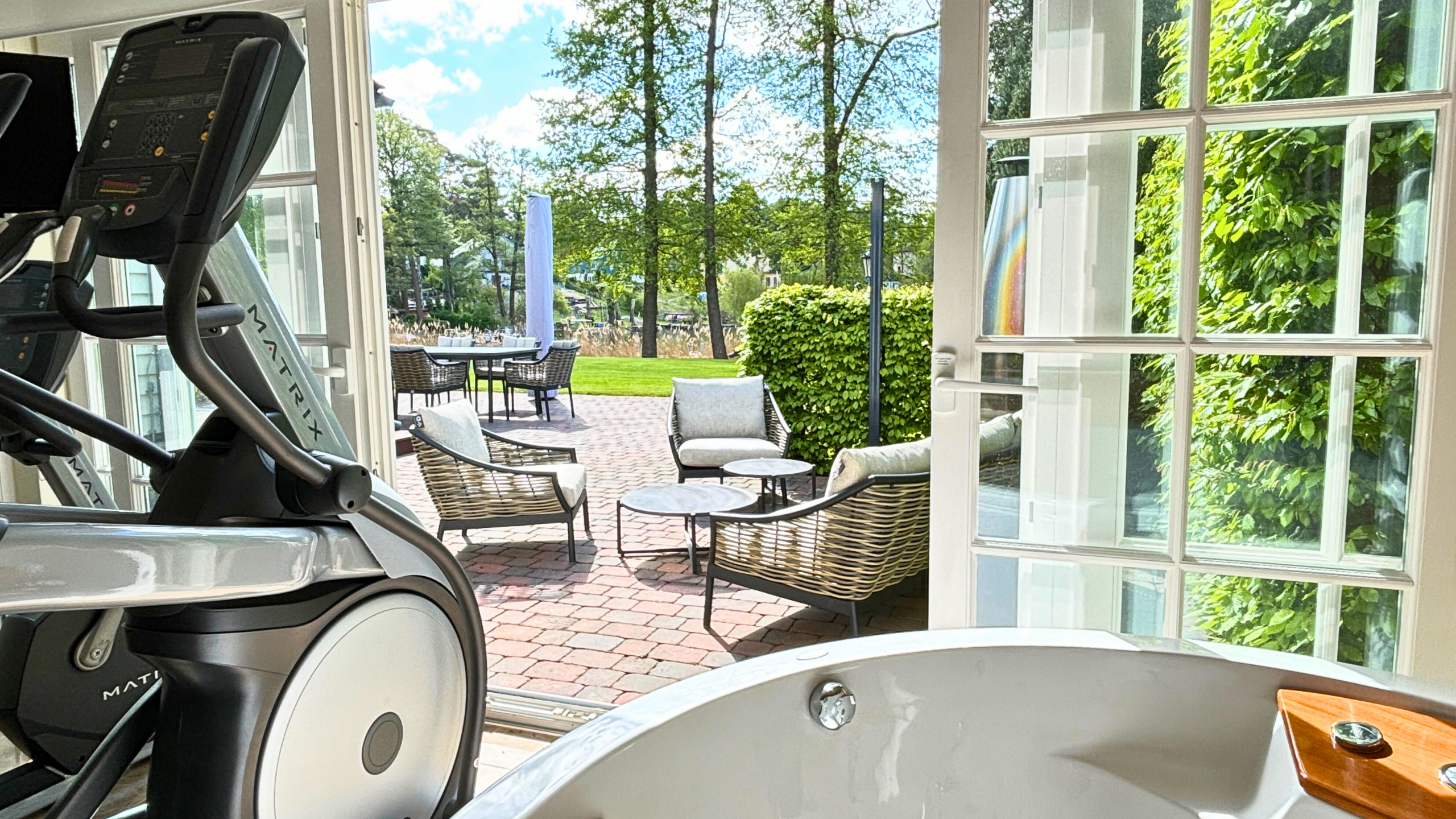 In zwei Schritten durch die Überdachung gelangt man an der Westseite des Hauses zum Spa Bereich. Ein kleines Holzhaus mit Sauna, Fitnessgeräten, Wirlpool und Dusche/WC lädt Körper und Seele zum Wellness ein. Öffnet man die Schiebetüren kann man direkt davor im Loungebereich relexan.